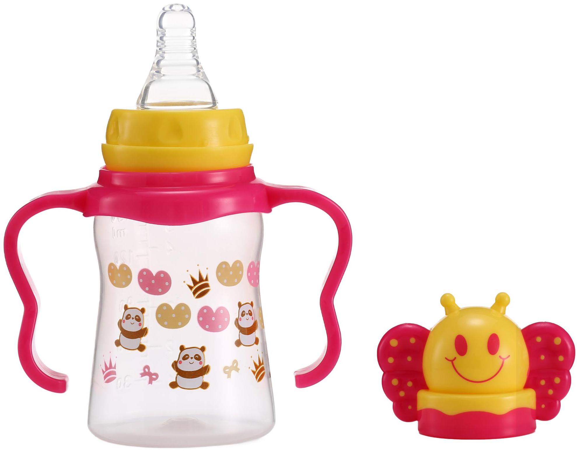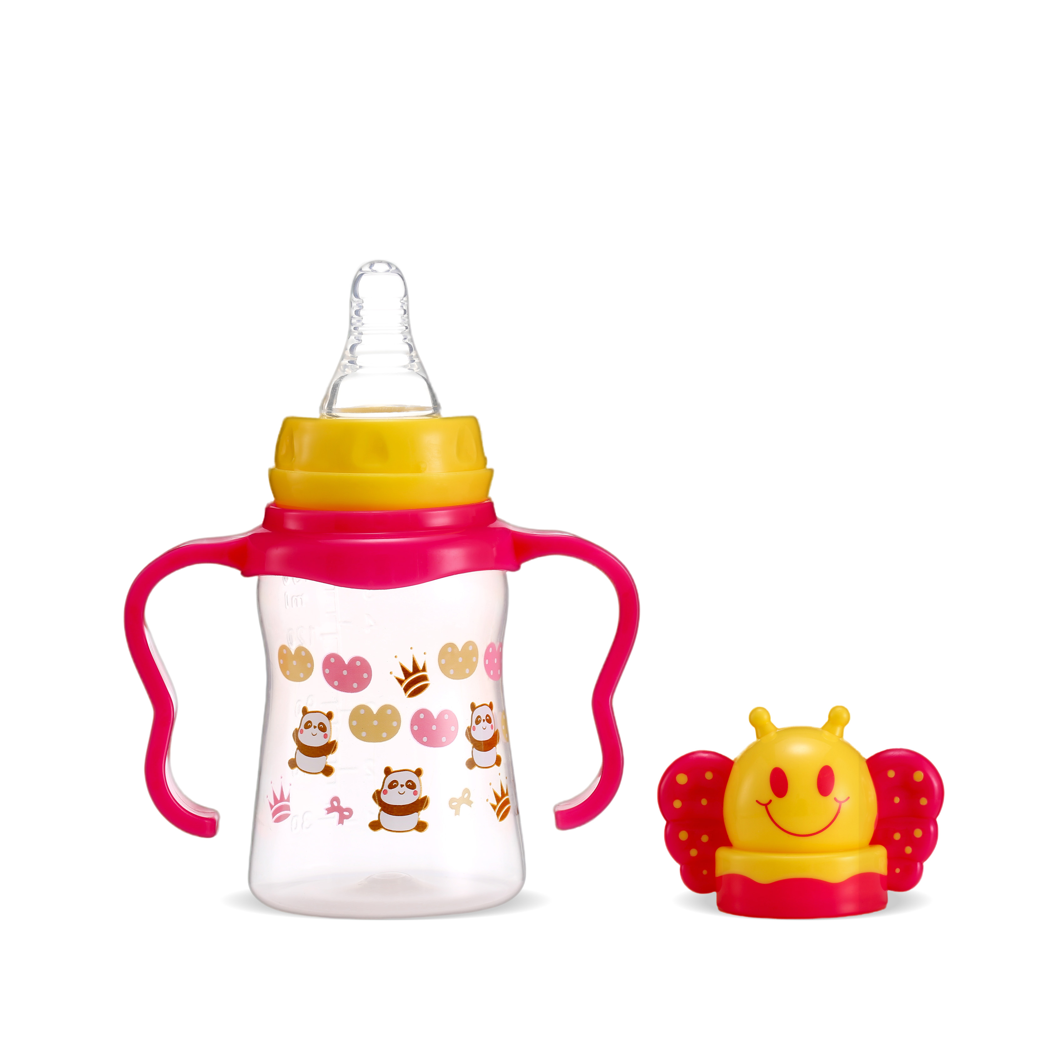 ISH Cartoon Sheep Bottle with sheep horn cap & animal prints. BPA-Free PP+silicone, curved handles. 150ml/280ml in pastel colors. Gift-ready for babies 6-24 months.