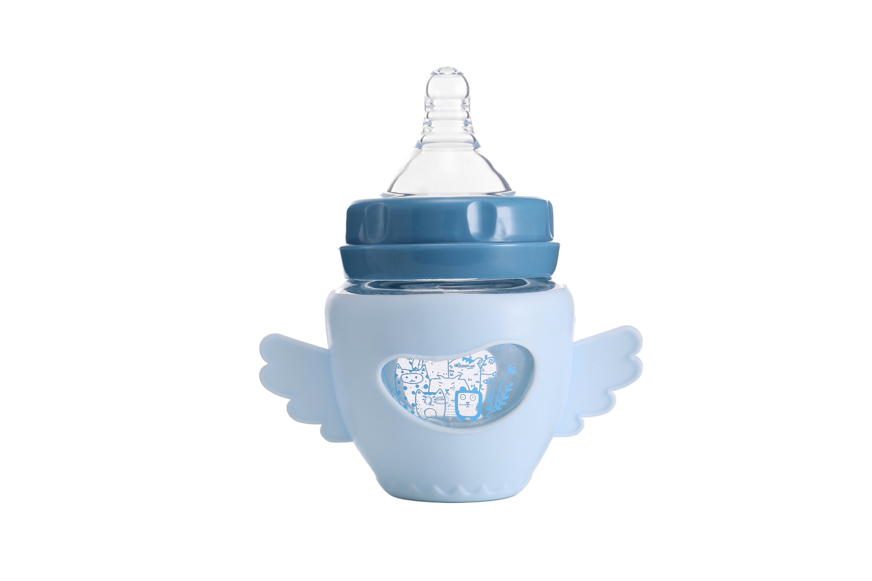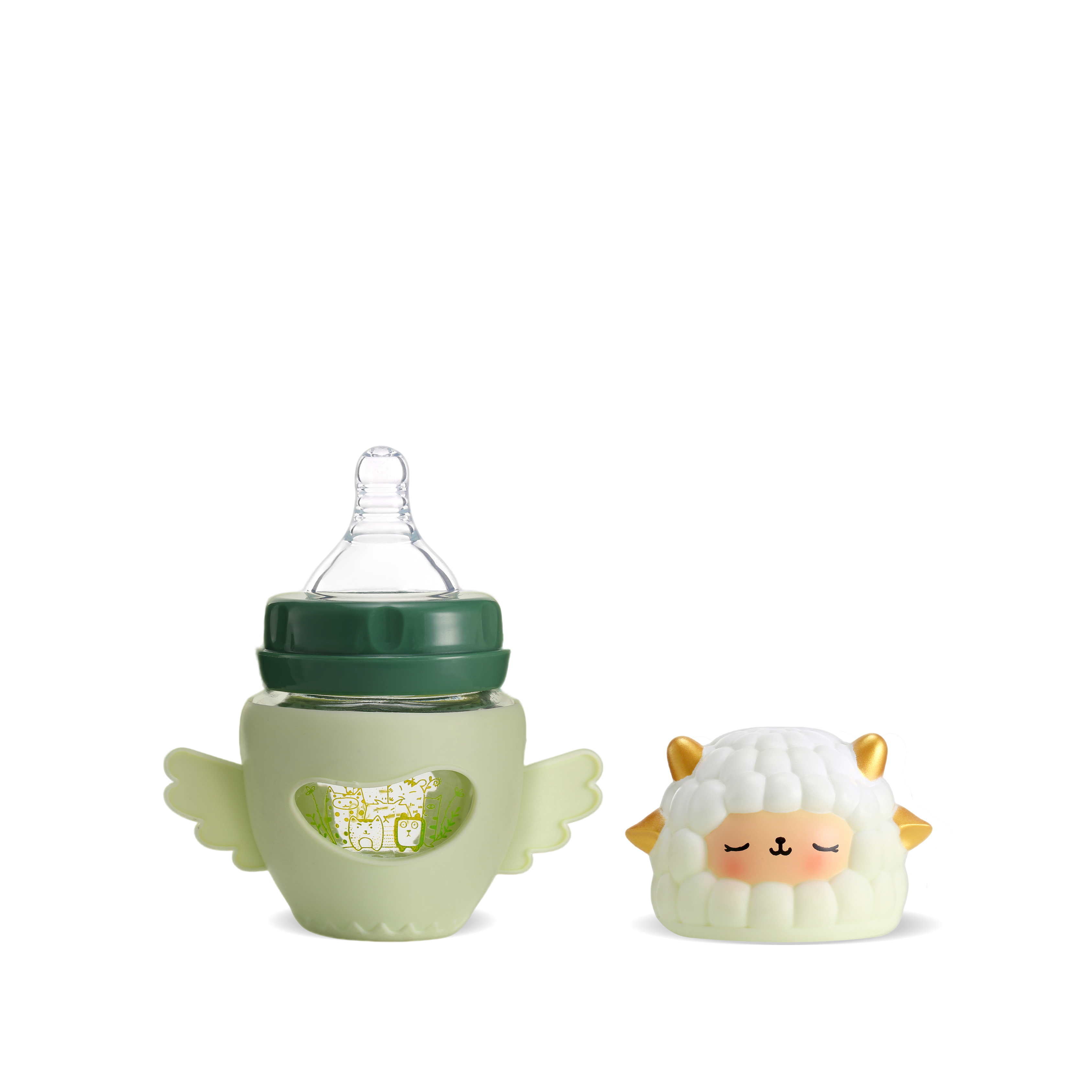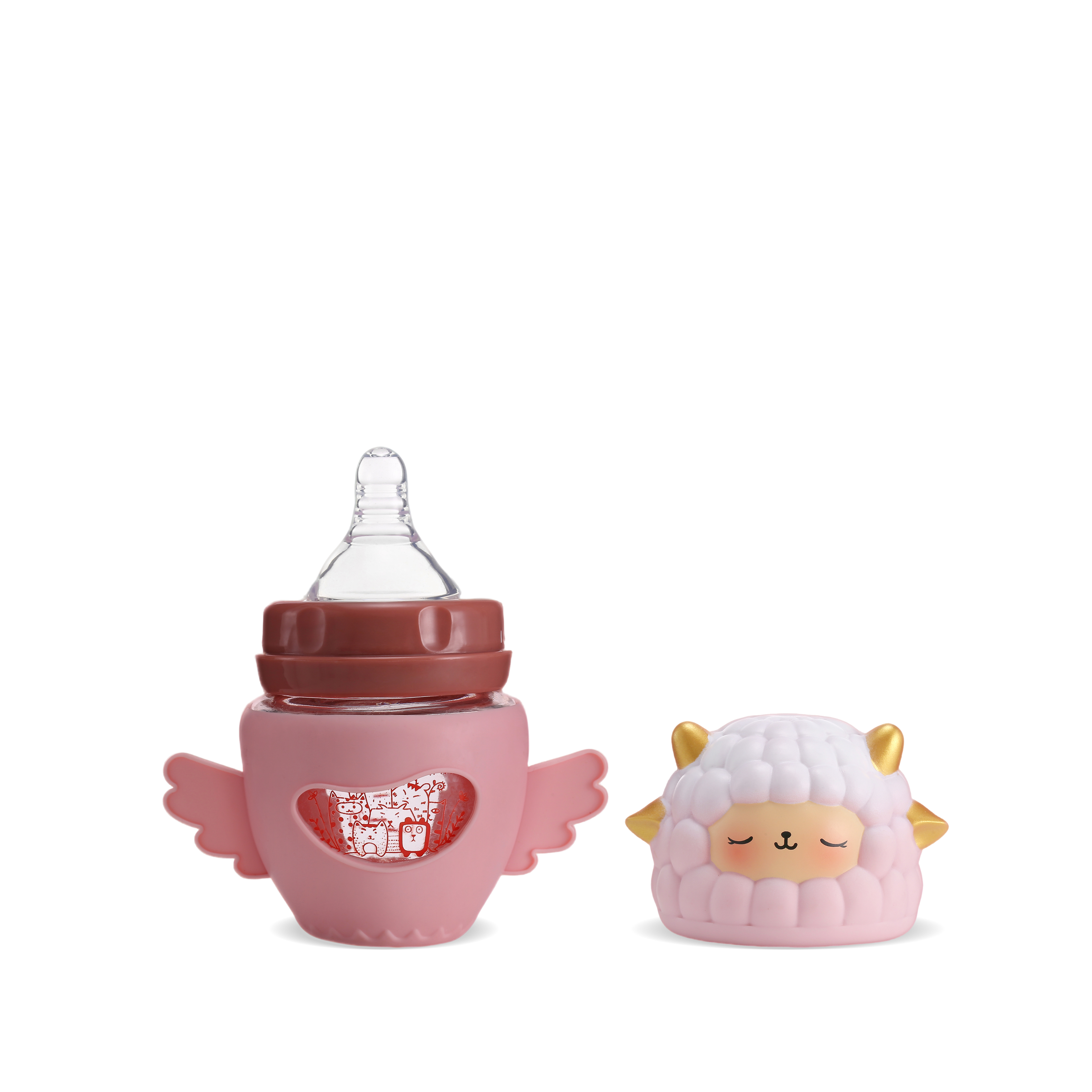 FISH Cartoon Sheep Glass Bottle – Sleepy sheep cap + angel wing handles! Borosilicate glass, 80ml newborn size. Enchanting gift in pastel pink/blue/green/purple (0-12M).
